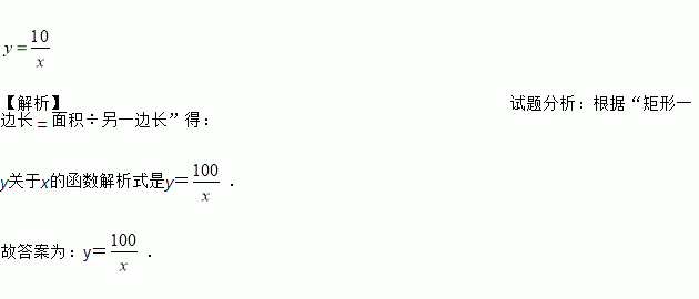 【解析】试题分析:根据“矩形一边长=面积÷另一边长”得: y关于x的函数解析式是y=. 故答案为:y=.