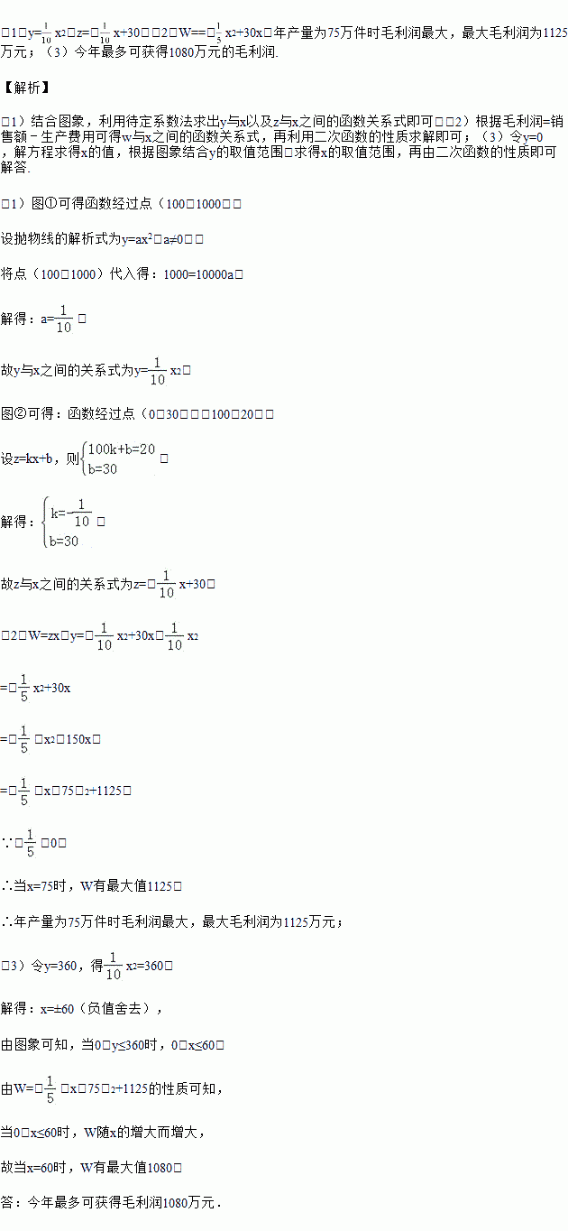 某市在党中央实施“精准扶贫”政策的号召下,大力开展科技扶贫工作,帮助农民组建农副产品销售公司,某农副产品的年产量不超过100万件,该产品的生产费用y(万元)与年产量x(万件)之间的函数图象是顶点为原点的抛物线的一部分(如图①所示);该产品的销售单价z(元/件)与年销售量x(万件)之间的函数图象是如图②所示的一条线段,生产出的产品都能在当年销售完,达到产销平衡,所获毛利润为w万元.(毛利润=销售额﹣生产费用)