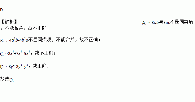 C. 2x2+7x2=9x4 D. 3y2-2y2=y2