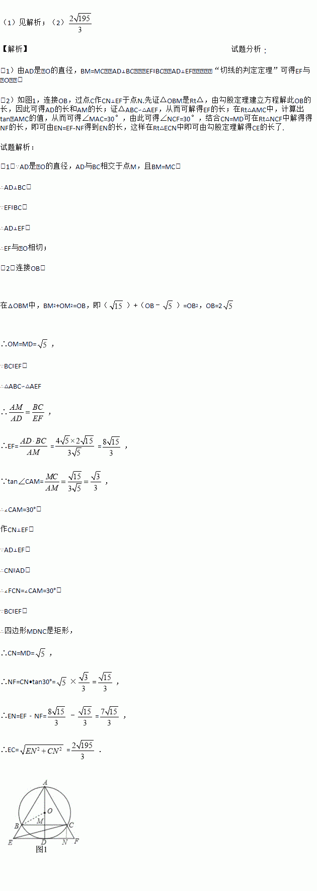 如图,⊙O是△ABC的外接圆,AD是⊙O的直径,AD与BC相交于点M,且BM=MC,过点D作BC的平行线,分别与AB、AC的延长线相交于点E、F.