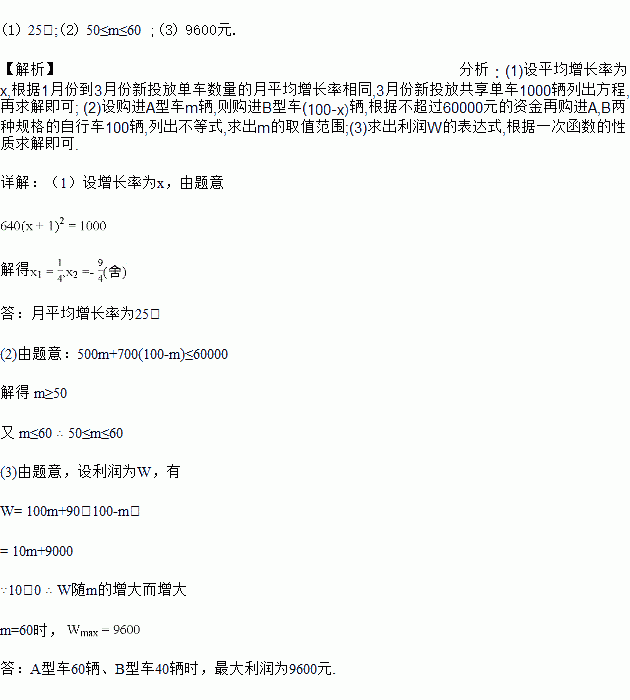 (1)若1月份到3月份新投放单车数量的月平均增长率相同,3月份新投放共享单车1000辆.求月平均增长率。