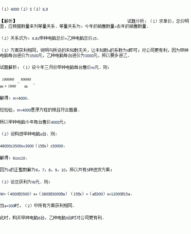 (1)今年三月份甲种电脑每台售价多少元?