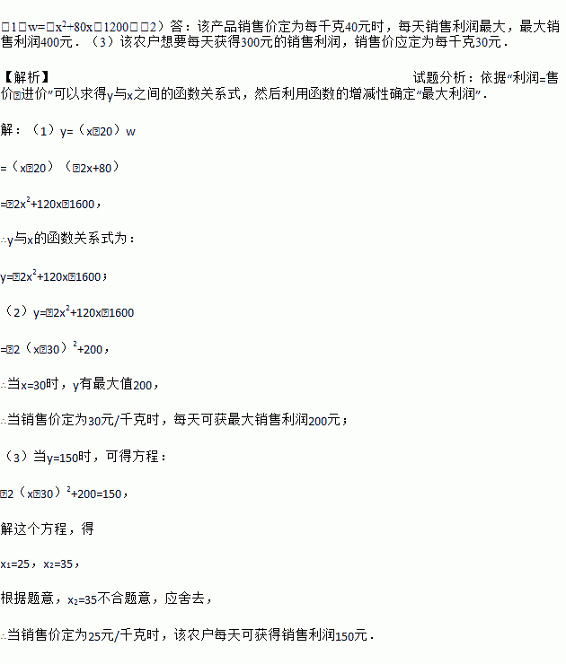 (3)如果物价部门规定这种产品的销售价不能高于每千克35元,该农户想要每天获得300元的销售利润,销售价应定为每千克多少元?