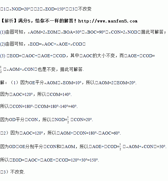 (1)若∠EOM=10°,求∠NOD的度数;