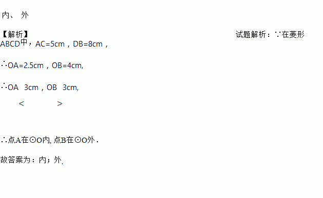 菱形ABCD的对角线相交于O点,AC=5cm,DB=8cm,以O为圆心,以3cm的长为半径作⊙O,则点A在⊙O______, 点B在⊙O______.