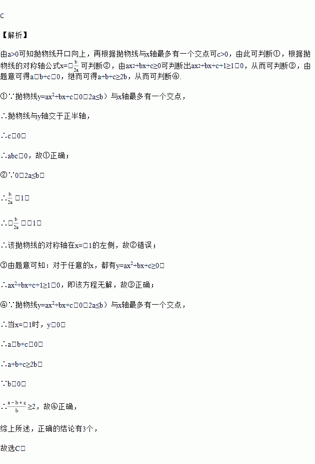 已知抛物线y=ax2+bx+c(0<2a≤b)与x轴最多有一个交点.以下四个结论: