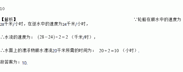 10 【解析】∵轮船在顺水中的速度为28千米/小时,在逆水中的速度为24千米/小时, ∴水流的速度为: (千米/时), ∴水面上的漂浮物顺水漂流20千米所需的时间为: (小时). 故答案为:10.