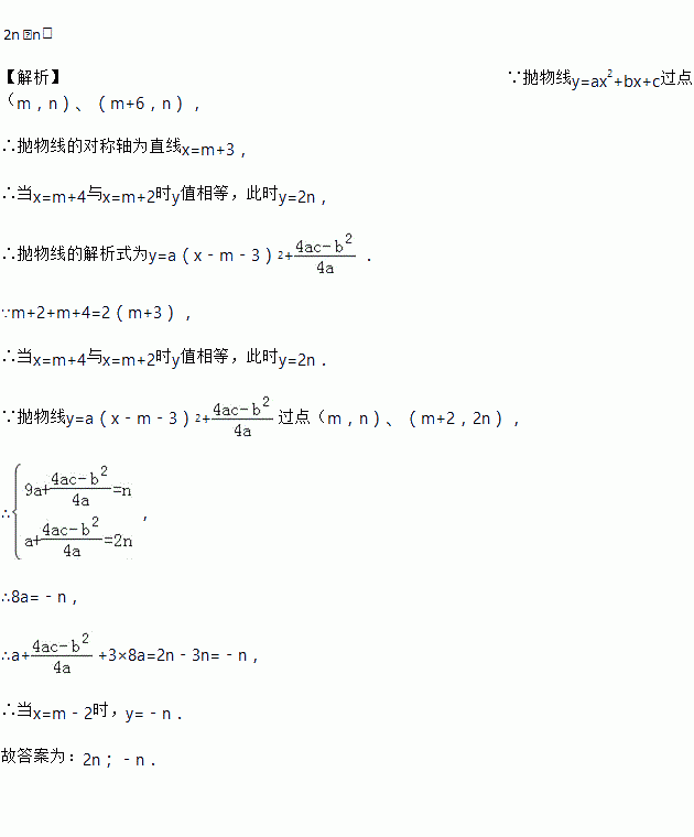 已知抛物线y=ax2+bx+c(a≠0)过以下三个点:(m,n),(m+2,2n),和(m+6,n),当抛物线上另有点的横坐标为m+4时,它的纵坐标为_____;当横坐标为m﹣2时,它的纵坐标为_____.