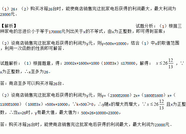 (1)商店至多可以购买冰箱多少台?