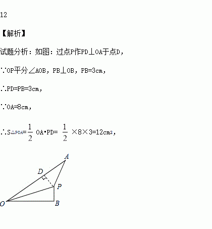 如图,OP平分∠AOB,PB⊥OB,OA=8 cm,PB=3 cm,则△POA的面积等于 .
