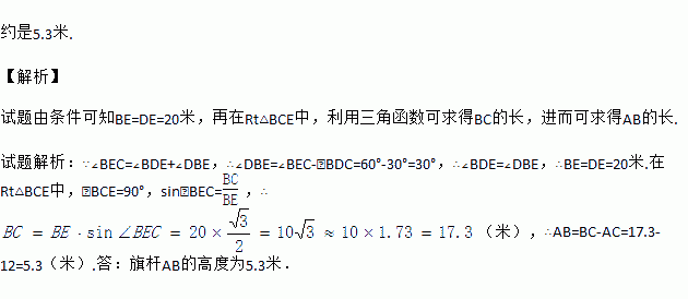 如图,某建筑物AC顶部有一旗杆AB,且点A,B,C在同一条直线上,小明在地面D处观测旗杆顶端B的仰角为30°,然后他正对建筑物的方向前进了20米到达地面的E处,又测得旗杆顶端B的仰角为60°,已知建筑物的高度AC=12m,求旗杆AB的高度(结果精确到0.1米).参考数据:
