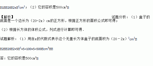 如图,小颖在边长为20cm的正方形纸片的四个角上各剪去一个边长为xcm的正方形,折成一个无盖的长方体盒子.