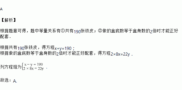 现有190张铁皮做盒子,每张铁皮可做8个盒身或22个盒底,一个盒身与两个盒底配成一个完整的盒子,设用x张铁皮做盒身,y张铁皮做盒底,则可列方程组为( )