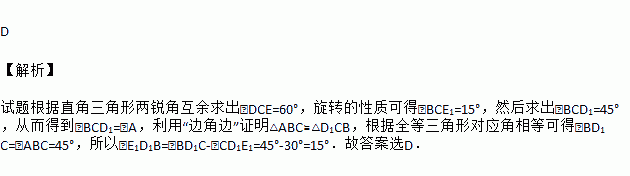 将两个斜边长相等的三角形纸片如图①放置,其中∠ACB=∠CED=90°,∠A=45°,∠D=30°.把∆DCE绕点C顺时针旋转15°得到∆D1CE1,如图②,连接D1B,则∠E1D1B的度数为( )