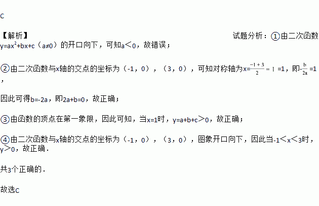 C 【解析】试题分析:①由二次函数y=ax2+bx+c(a≠0)的开口向下,可知a<0,故错误; ②由二次函数与x轴的交点的坐标为(-1,0),(3,0),可知对称轴为x==1,即-=1, 因此可得b=-2a,即2a+b=0,故正确; ③由函数的顶点在第一象限,因此可知,当x=1时,y=a+b+c>0,故正确; ④由二次函数与x轴的交点的坐标为(-1,0),(3,0)...