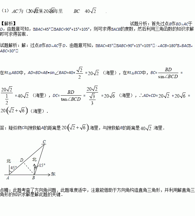 如图,某天在南印度洋海域有两艘自西向东航行的搜救船A、B,B船在A船的正东方向,且两船保持40海里的距离.某一时刻两船同时测得在A的东北方向,B的北偏东15°方向有一疑似物C,求此时疑似物C与搜救船A、B的距离各是多少?(结果保留根号)