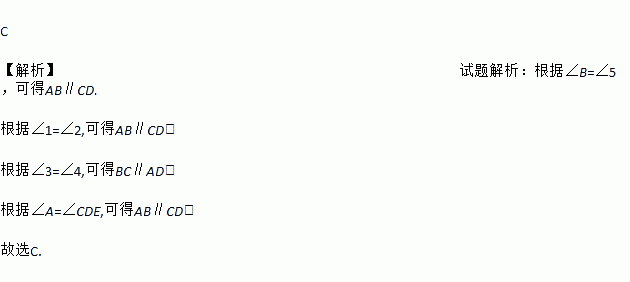A. ∠B=∠5 B. ∠1=∠2 C. ∠3=∠4 D. ∠B+∠BCD=180°