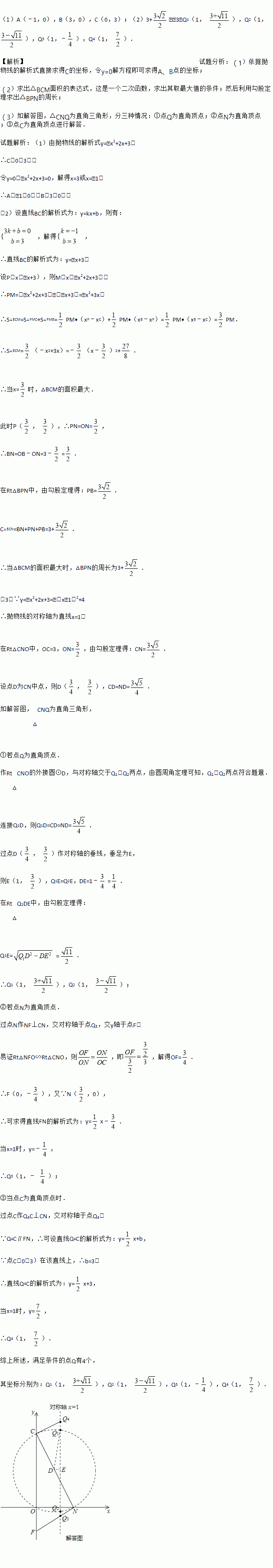 (3)在(2)的条件下,当△BCM的面积最大时,在抛物线的对称轴上存在一点Q,使得△CNQ为直角三角形,求点Q的坐标.
