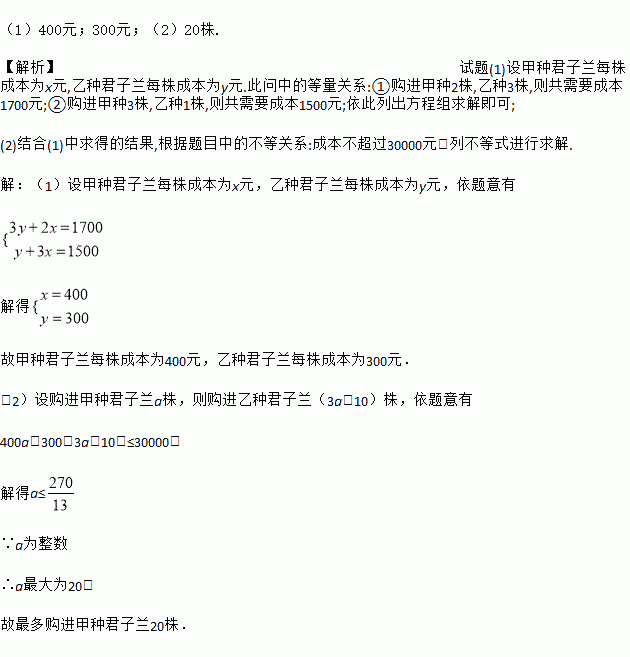 (2)该种植基地决定在成本不超过30000元的前提下购入甲、乙两种君子兰,若购入乙种君子兰的株数比甲种君子兰的3倍还多10株,求最多购进甲种君子兰多少株?
