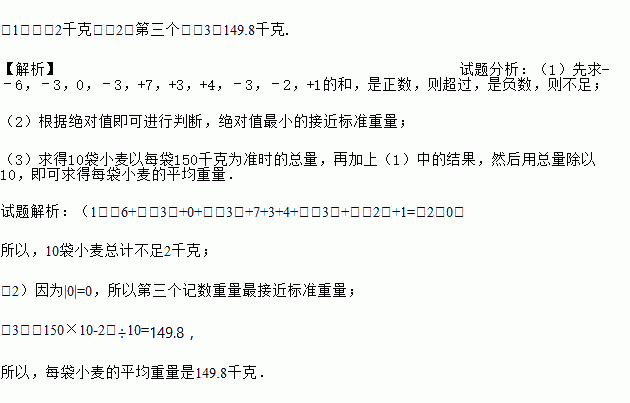 (1)不足2千克;(2)第三个;(3)149.8千克. 【解析】试题分析:(1)先求-﹣6,﹣3,0,﹣3,+7,+3,+4,﹣3,﹣2,+1的和,是正数,则超过,是负数,则不足; (2)根据绝对值即可进行判断,绝对值最小的接近标准重量; (3)求得10袋小麦以每袋150千克为准时的总量,再加上(1)中的结果,然后用总量除以10,即可求得每袋小麦的平均重量. 试题解析:(1...
