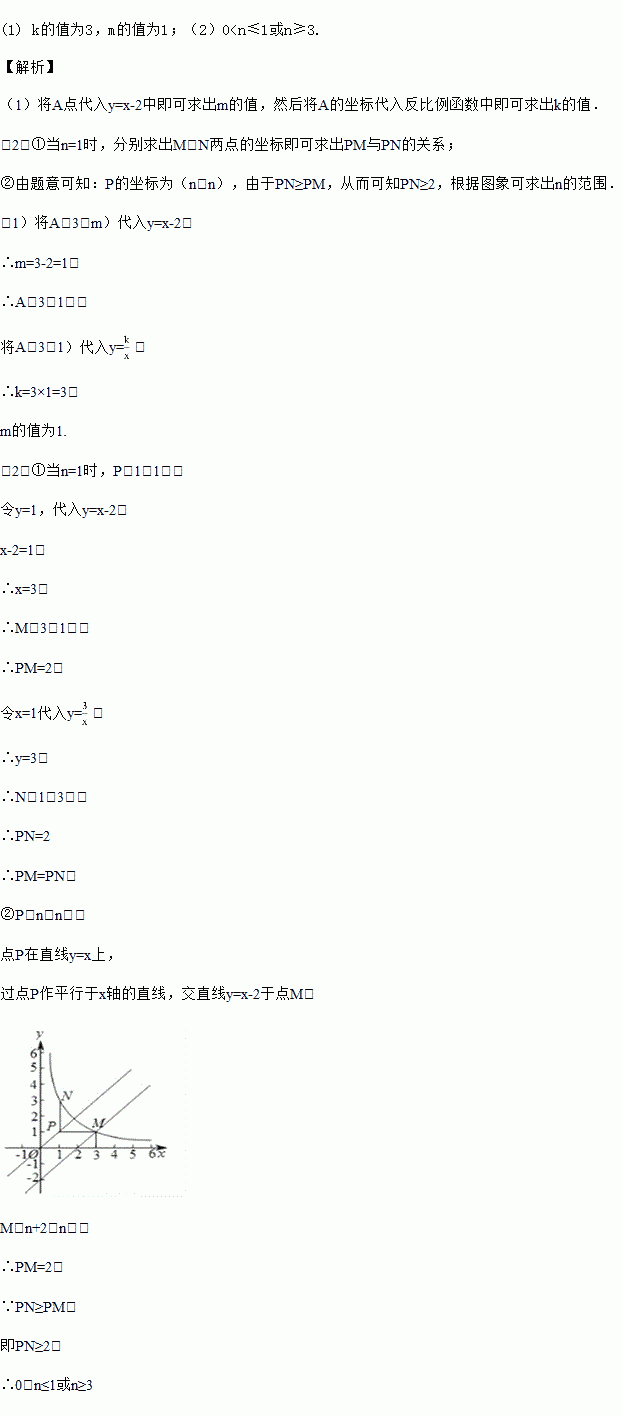 (2)已知点P(n,n)(n>0),过点P作平行于轴的直线,交直线y=x-2于点M,过点P作平行于y轴的直线,交函数![]()