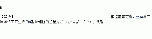 (2017·河北省期中)某工厂生产A,B两种型号的螺丝,在2016年12月底时,该工厂统计了2016年下半年生产的两种型号螺丝的总量,据统计2016年下半年生产的A型号螺丝的总量为a12个,A型号螺丝的总量是B型号的a4倍,则2016年下半年该工厂生产的B型号螺丝的总量为( )