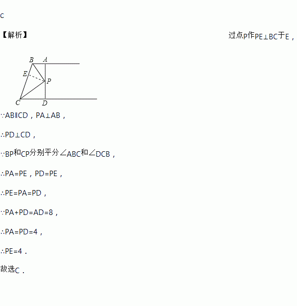 C 【解析】过点P作PE⊥BC于E, ∵AB∥CD,PA⊥AB, ∴PD⊥CD, ∵BP和CP分别平分∠ABC和∠DCB, ∴PA=PE,PD=PE, ∴PE=PA=PD, ∵PA+PD=AD=8, ∴PA=PD=4, ∴PE=4. 故选C.