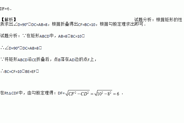 如图,在矩形ABCD中,AB=8,BC=10,E是AB上一点,将矩形ABCD沿CE折叠后,点B落在AD边的点F上,求DF的长为多少?