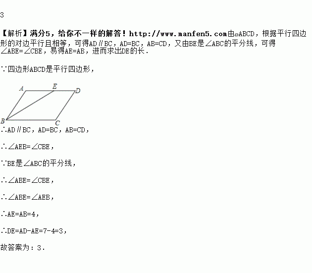 如图,在□ABCD中,AB=4,BC=7,∠ABC的平分线BE交AD于点E,则DE=____________.
