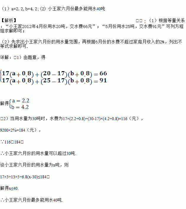 (2)随着夏天的到来,用水量将增加.为了节省开支,小王计划把6月份的水费控制在不超过家庭月收入的2%.若小王家的月收入为9200元,则小王家6月份最多能用水多少吨?