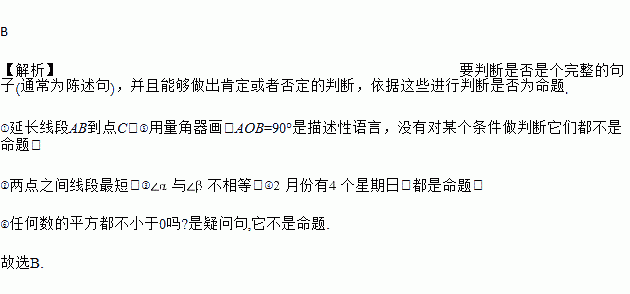 下列句子:①延长线段到点;②两点之间线段最短;③与不相等;④月份有个星期日;⑤用量角器画;⑥任何数的平方都不小于吗?其中是命题的有( )个.