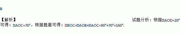 将一副直角三角尺如图放置,若∠AOD=20°, 则∠BOC的大小为( )
