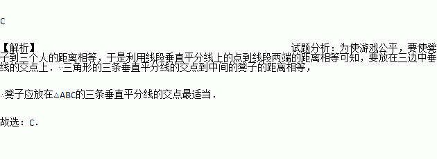 在联谊会上,有A.B.C三名选手站在一个三角形的三个顶点位置上,他们在玩抢凳子游戏,要在他们中间放一个木凳,谁先抢到凳子谁获胜,为使游戏公平,则凳子应放的最适当的位置是在△ABC的( )