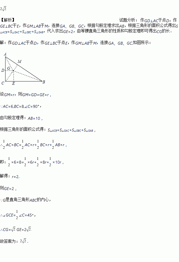 已知G是直角三角形ABC的内心,∠C=90°,AC=6,BC=8,则线段CG的长为______.