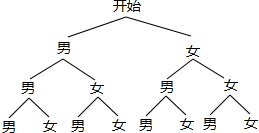2.2015年国家实施“全面二孩政策”,人民医院迎来人口出生小高峰,某天出生了3个婴儿,假设生男生女的机会相同,那么这3个婴儿中,出现1个男婴、2个女婴的概率是多少?画出树状图或列表.分析 首先根据题意画出树状图,然后由树状图即可求得共有8种可能结果;出现1个男婴、2个女婴的有3种情况,再利用概率公式求解即可求得答案.