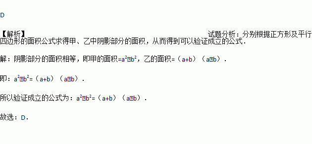 从边长为a的大正方形纸板中挖去一个边长为b的小正方形纸板后,将其裁成四个相同的等腰梯形(如图甲),然后拼成一个平行四边形(如图乙).那么通过计算两个图形阴影部分的面积,可以验证成立的公式为( )