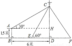 如图,在电线杆上的C处引拉线CE、CF固定电线杆,拉线CE和地面成60°角,在离电线杆6米的B处安置测角仪,在A处测得电线杆上C处的仰角为30°,已知测角仪高AB为1.5米,求拉线CE的长(结果保留根号).