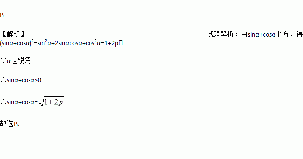 若α是锐角,sinαcosα=p,则sinα+cosα的值是( )