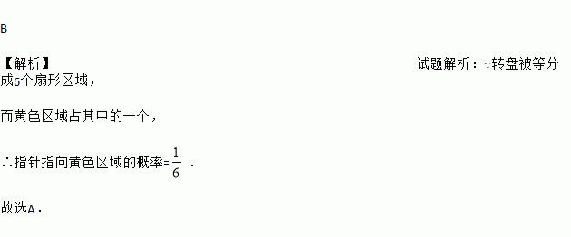如图,一个可以自由转动的转盘被等分成6个扇形区域,并涂上了相应 的颜色,转动转盘,转盘停止后,指针指向蓝色区域的概率是 ( )