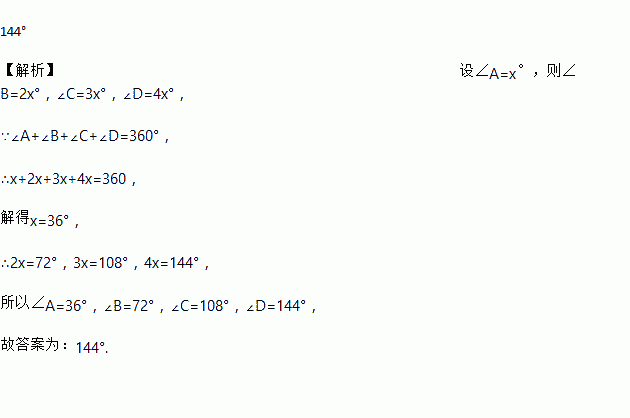 在四边形ABCD中,如果∠A:∠B:∠C:∠D=1:2:3:4,则∠D=______