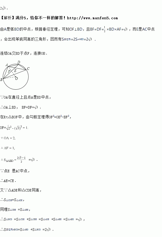 如图所示,⊙O半径为2,弦BD=2,A为弧BD的中点,E为弦AC的中点,且在BD上,求四边形ABCD的面积.