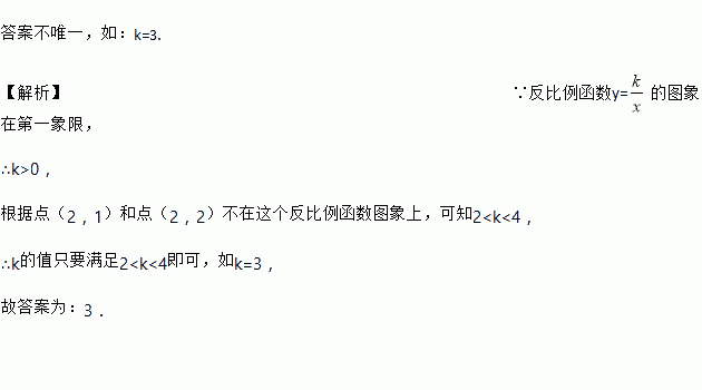 反比例函数y=在第一象限的图象如图,请写出一个满足条件的k值,k=__________.