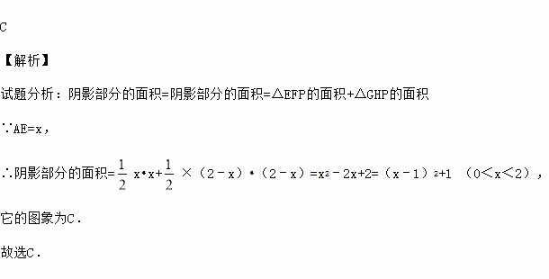 如图,正方形纸片ABCD的边长为2,翻折∠B、∠D,使两个直角的顶点重合于对角线BD上一点P、EF、GH分别是折痕(如图2).设BE=x(0<x<2),阴影部分面积为y,则y与x之间的函数图象为( )
