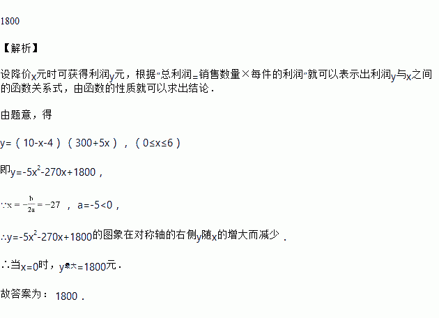 合肥百货大厦某店卖一种狗宝宝布娃娃纪念品,已知成批购进时单价为4元,根据市场调查,销售量与销售单价在一段时间内满足如下关系:单价为10元时销售量为300枚,而单价每降低1元,就可多售出5枚,那么求可获得最大利润为__元.