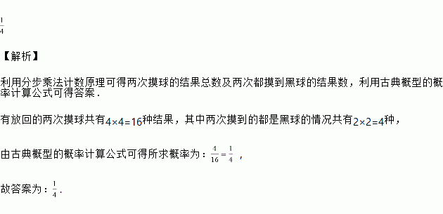 从一个装有2黄2黑的袋子里有放回地两次摸到的都是黑球的概率是_______.