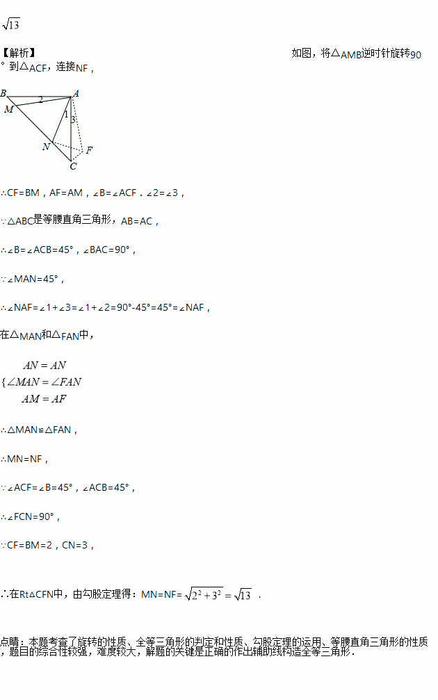 如图,等腰直角三角形ABC中,∠BAC=90°,AB=AC,点M,N在边BC上,且∠MAN=45°.若BM=2,CN=3,则MN的长为______.