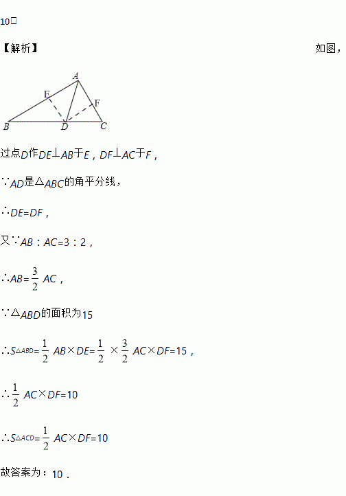 如图,AD是△ABC的角平分线,AB:AC=3:2,△ABD的面积为15,则△ACD的面积为 .