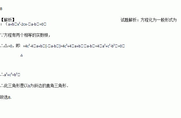 若a.b.c是△ABC的三边,且关于x的方程有两个相等的实数根,则△ABC是( )