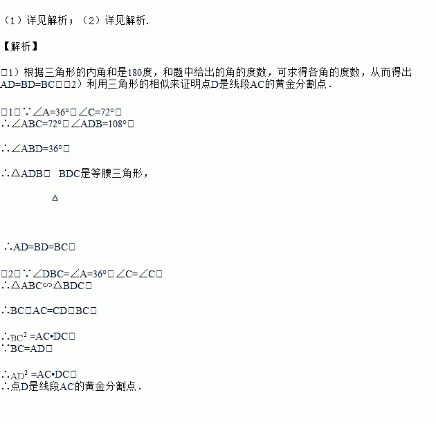 如图,已知△ABC中,D是AC边上一点,∠A=36º,∠C=72º,∠ADB=108º。