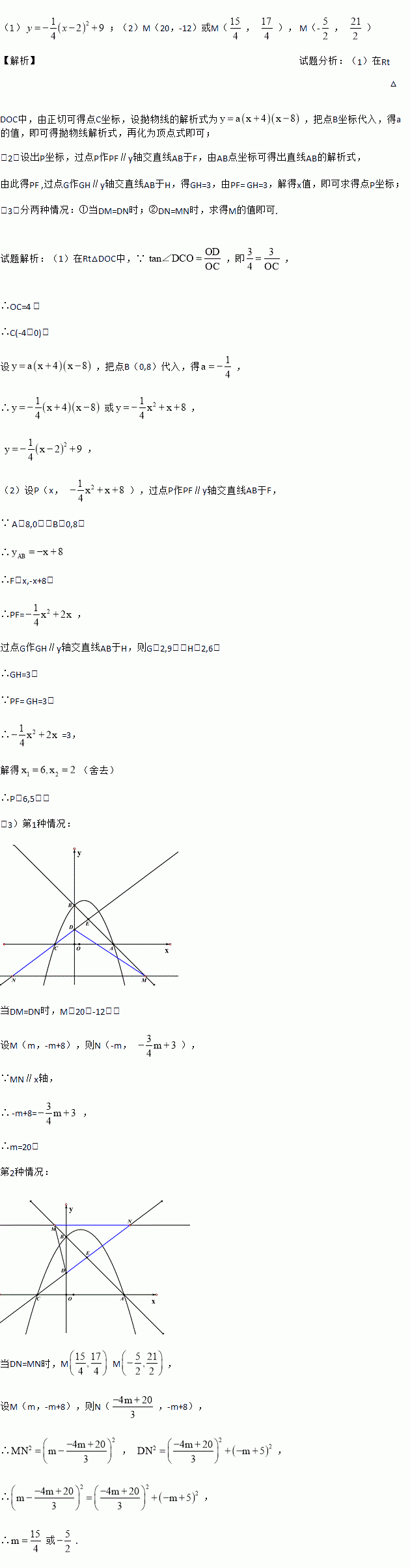 如图,在平面直角坐标系中,抛物线试纸y=ax2+bx+c与x轴交于点A,C,与y轴交于点B.已知点A坐标为(8,0),点B为(0,8),点D为(0,3),tan∠DCO=